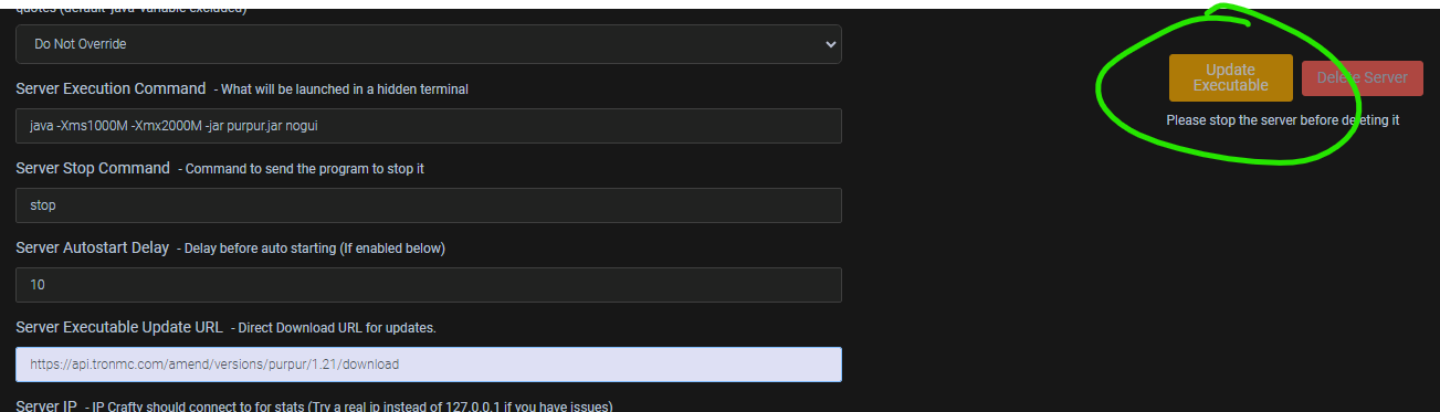 您可以在可执行文件 URL 中放置 `https://api.tronmc.com/amend/versions/(SERVER TYPE HERE)/1.21.7/download/` 并点击 **`Update Executable`** 来下载服务器 jar 的最新版本。
